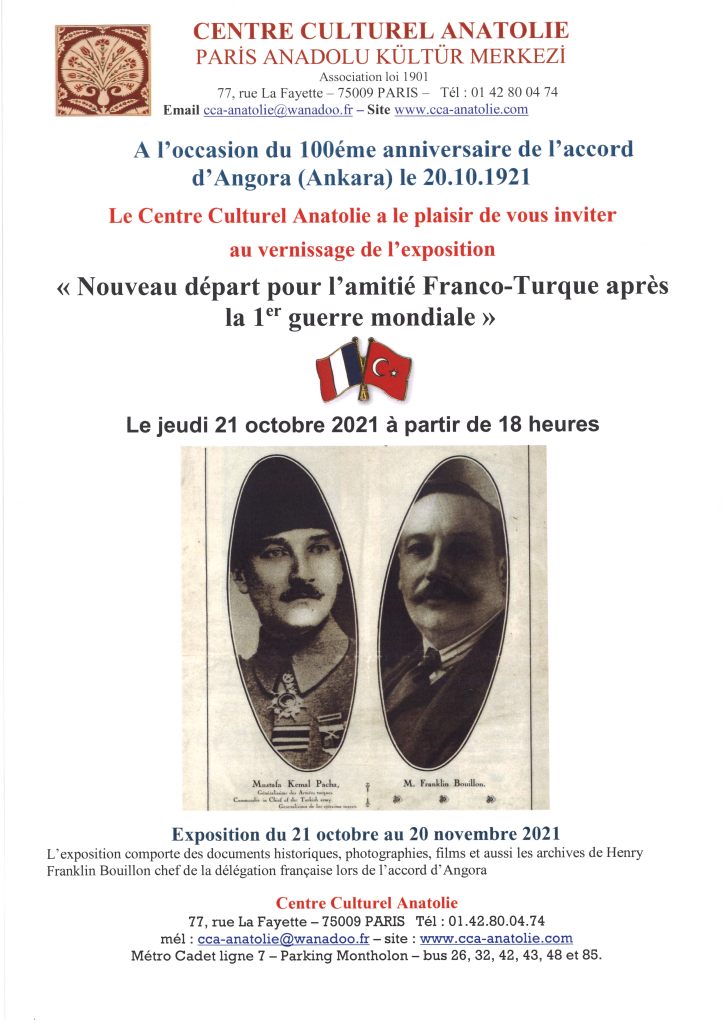 – à Paris : Le Centre culturel Anatolie (77, rue La Fayette, 75009) propose une exposition jusqu’au 20 novembre intitulée « Nouveau départ pour l’amitié franco-turque après la Première Guerre mondiale« .