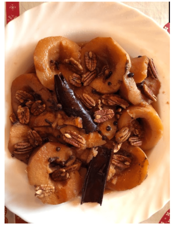 Dans un plat de service disposez les coings, ajouter du sirop d’érable et des noix de pécan.