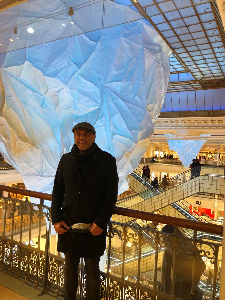 Né en 1976 à Mersin, Mehmet Ali Uysal est très jeune attiré par l’art, suit une formation d’architecte puis se dirige vers la sculpture. Après ses cours à l’université Hacettepe d’Ankara, il passe quelques mois à Bourges dans le cadre d’un échange, à l’École nationale supérieure d’art. Il se partage entre la France et la Turquie, du moins quand il n’expose pas à Beijing, Londres, Shanghai, New York, Dubaï ou Berlin. Le monde entier l’enchante et il réenchante le monde entier, que ce soit avec une pince à linge géante sur une prairie de la Meuse, un origami de bateau en plein air ou sa dernière installation au Bon Marché Rive Gauche à Paris, où nous avons eu la chance de le rencontrer pour le Comité France-Turquie.