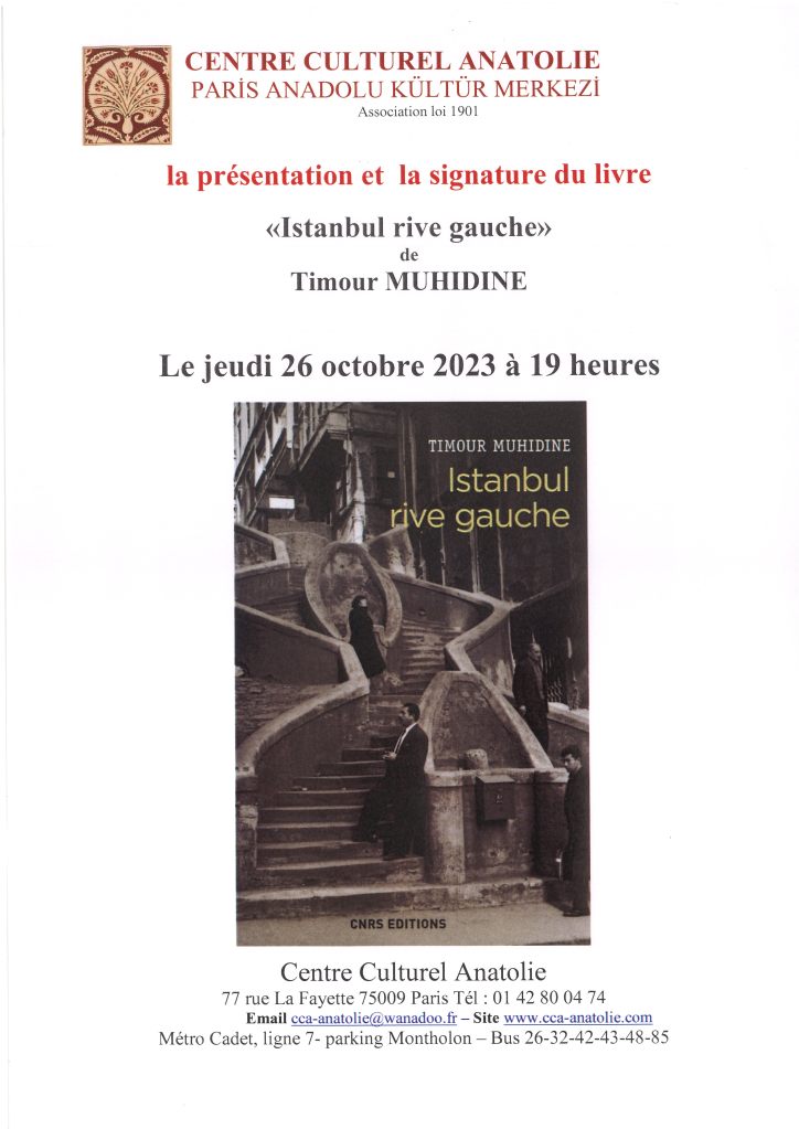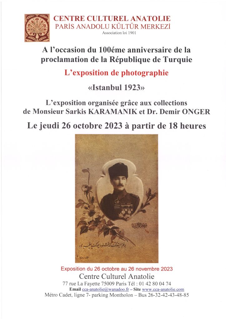 A l’occasion du 100éme anniversaire de la proclamation de la République de Turquie, le Centre Culturel Anatolie organise la présentation et la signature du livre «Istanbul rive gauche» de Timour MUHIDINE et présente l’exposition de photographie «Istanbul 1923». L’exposition est organisée grâce aux collections de Monsieur Sarkis KARAMANIK et Dr. Demir ONGER.